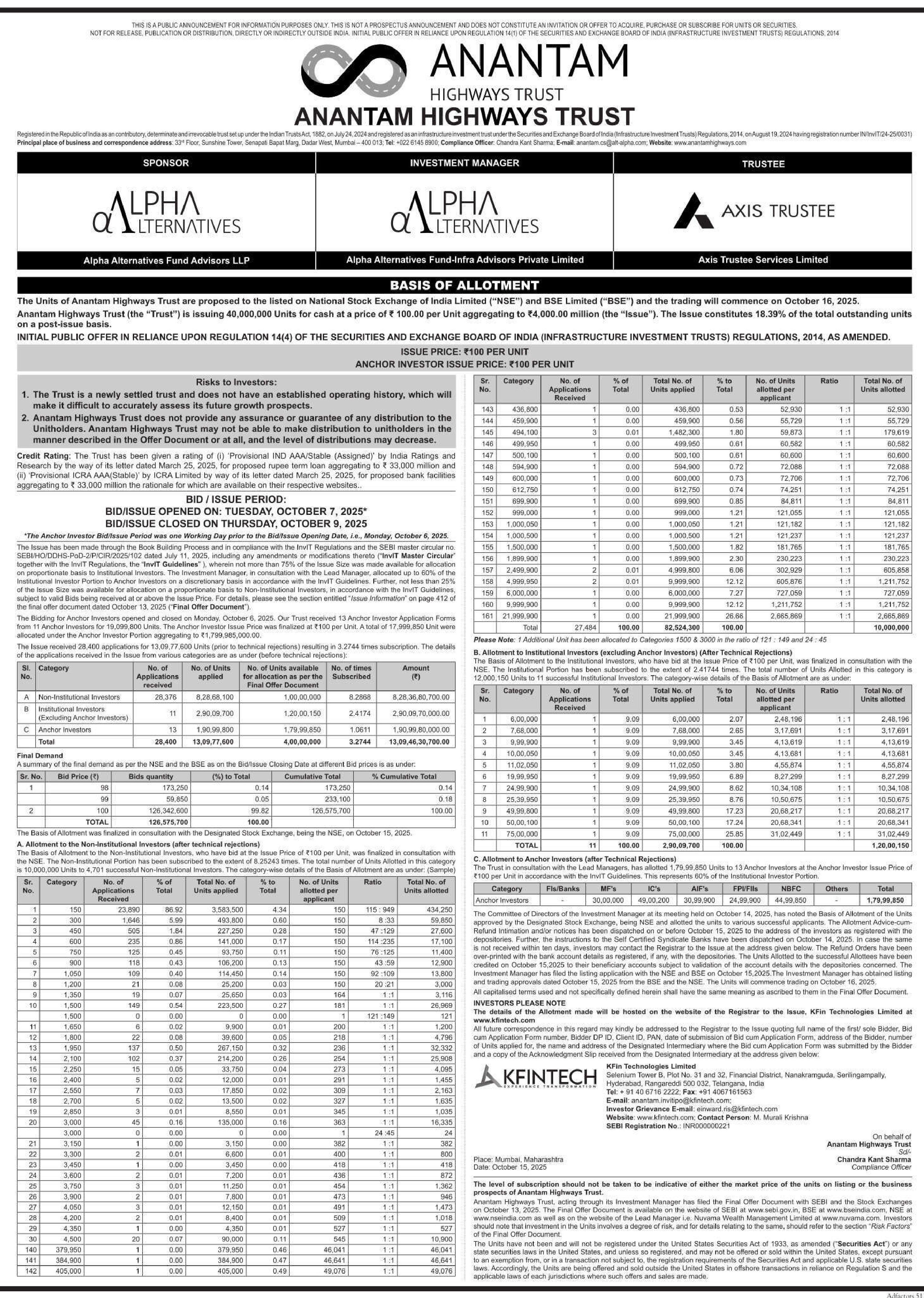 Anantam Highways Trust (InvIT) Lot(s) Distribution