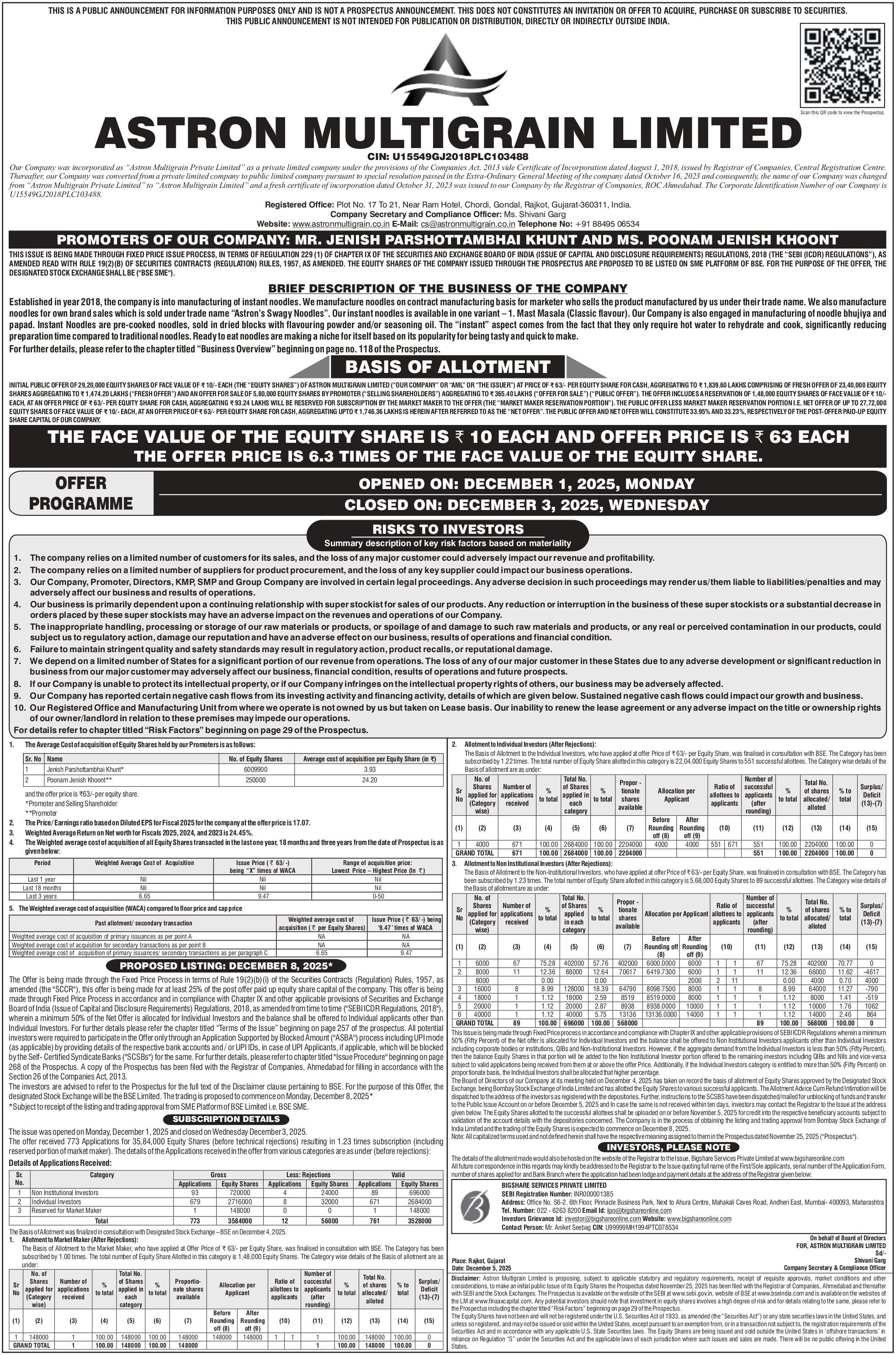 Astron Multigrain Ltd. (BSE SME)