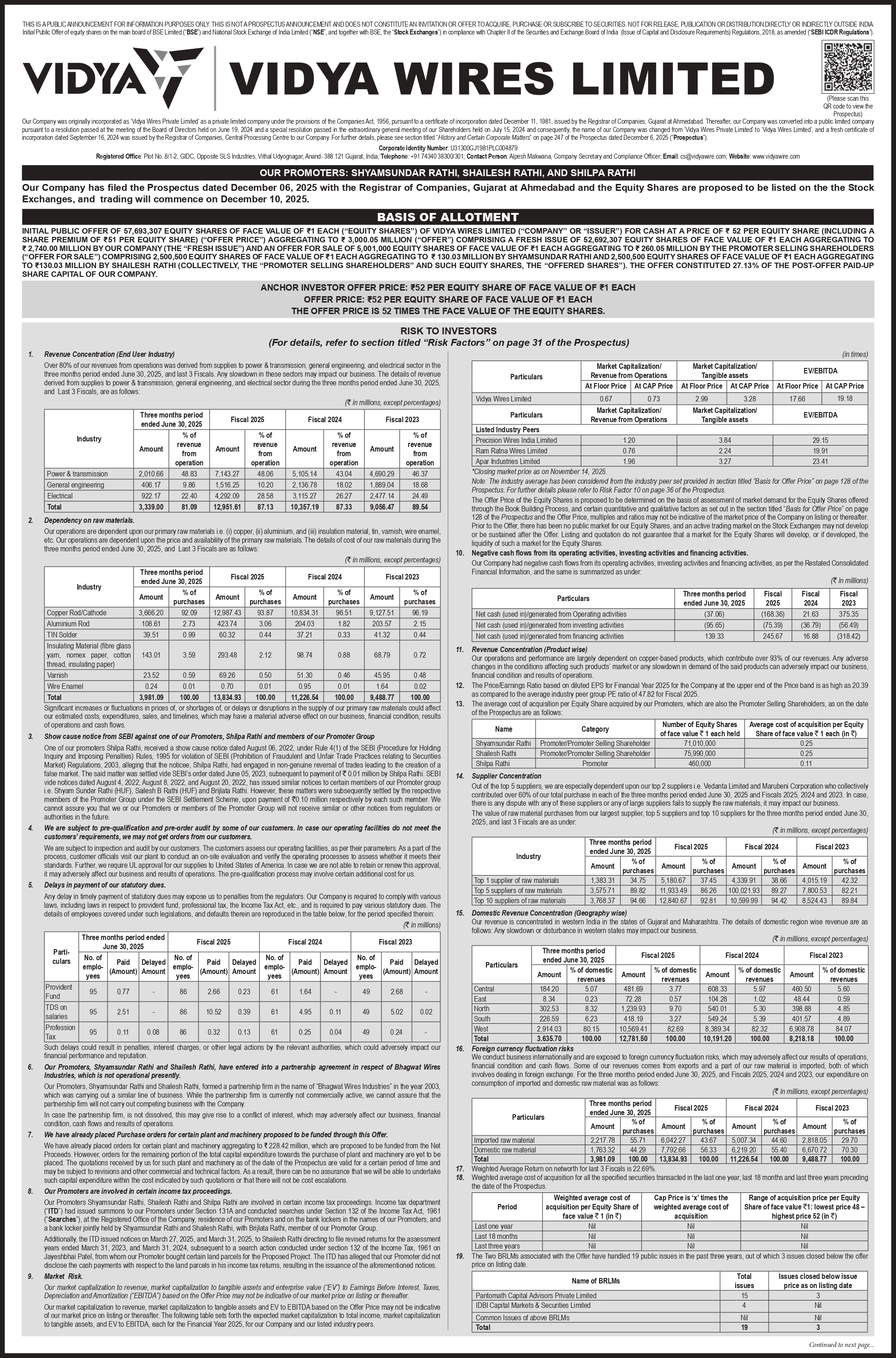 Potential Conflict of Interest from Promoters’ Partnership Firm: Two promoters are partners in Bhagwat Wires Industries, a non-operational firm engaged in a similar line of business. If the firm resumes operations or is not dissolved, it may create a conflict of interest, which could adversely affect the company’s business, cash flows, and overall performance.