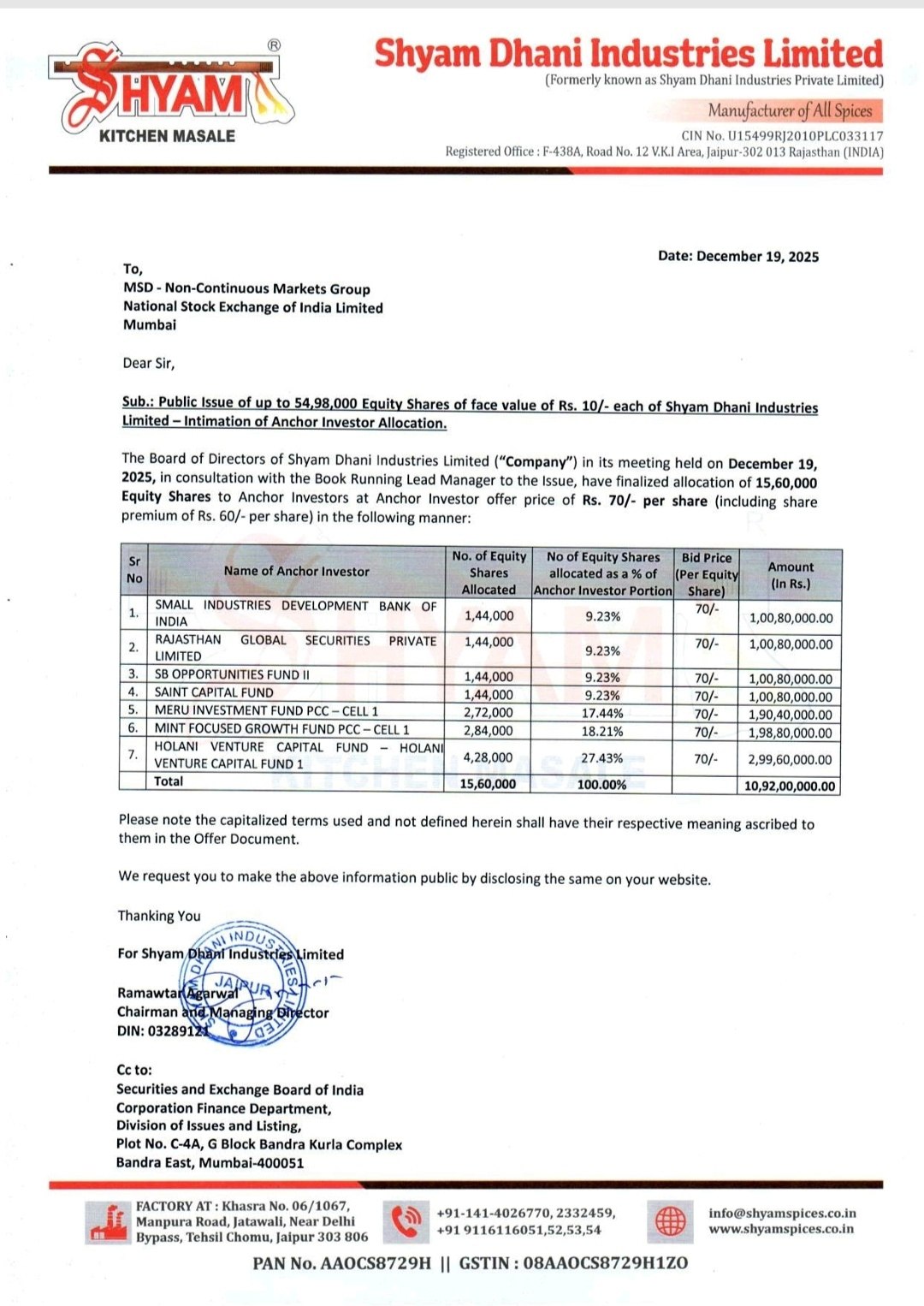 The company processes 163 varieties of spices—covering ground, blended, and whole spices—under its flagship brand “SHYAM.” Its manufacturing facility is located in Jaipur, Rajasthan.